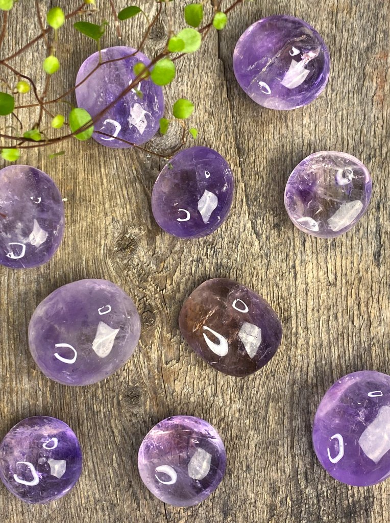 Very fine polished stones with slightly varying shapes. The stones have a beautiful shiny interior and vary in natural shades of purple and yellow.