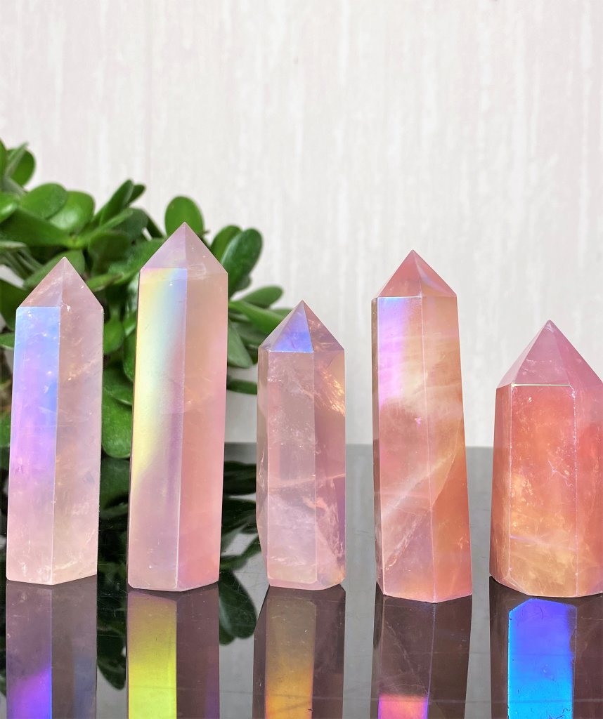 Rose Quartz Aura is a very beautiful crystal that is treated to get your rainbow-like colors. The crystal is a real stone vs. a quartz that is dipped in precious metals and then treated in a "pressure chamber" where it gets its permanent color.
