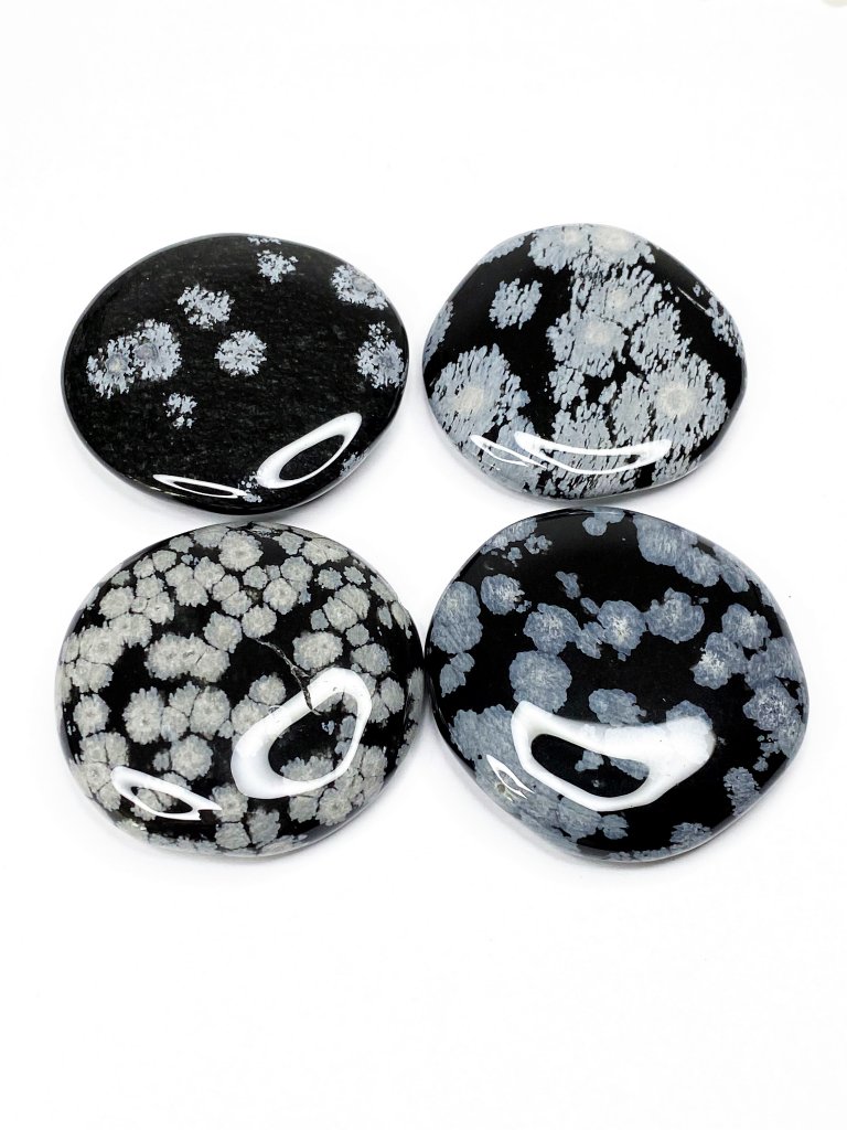 Snowflake Obsidian bears a beautiful unique pattern with a black base and gray/white spots called spherulites. These patterns appear in the stone when cristobalite combines with the lava mass as it cools.
