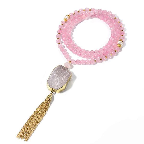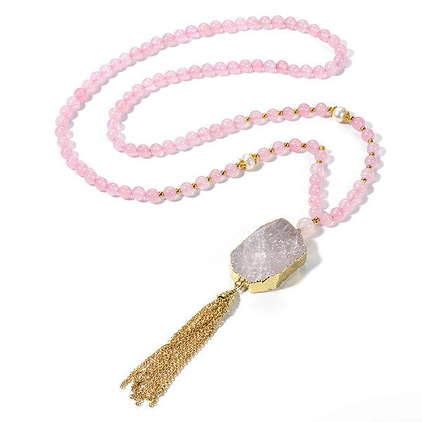 A beautiful mala with a rose quartz pendant and a metal tassel