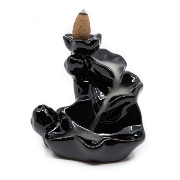 A beautiful Backflow incense holder in black ceramic, where the smoke from incense cones will single downwards and create a beautiful waterfall of smoke.