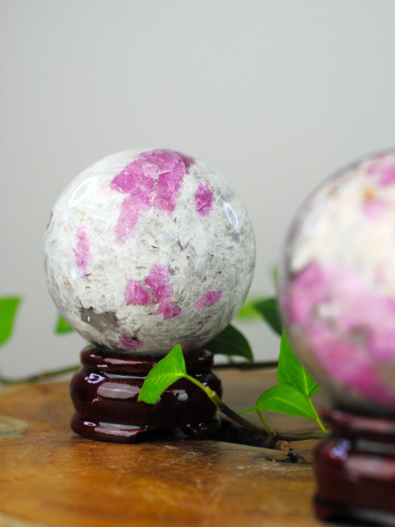 Vackra unika klot i rosa Turmalin. Kloten har varierande mönster och toner vilket gör varje sten helt unik. Mönsten kan variera i gråa, vita och rosa färger och inslag.