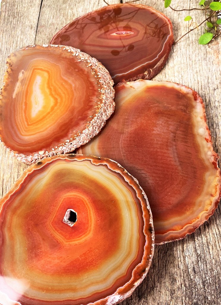 Agat skivor har ett högt dekorativs värde och kan fördelaktigt placeras på altare eller användas under healing och meditation. Den sägs bära på kraftfulla helande egenskaper och läka emotionella sår som svartsjuka, avund och rädsla, samt lindra vid stress och oro.