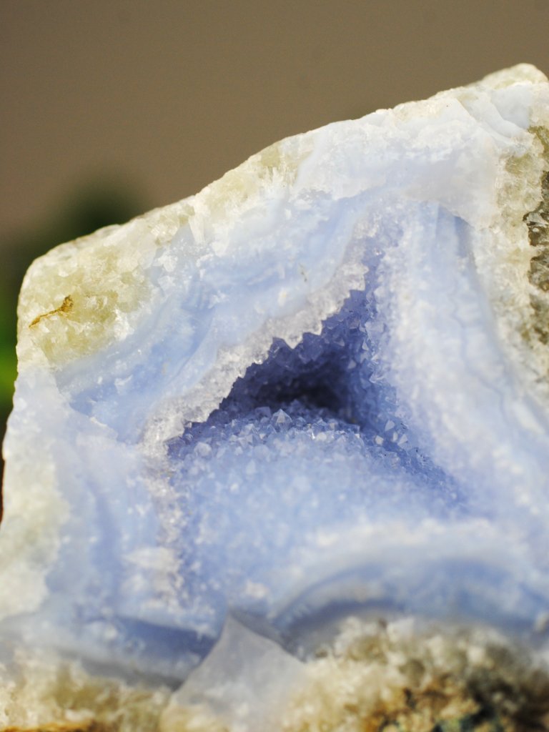 Fint och unikt kluster i Blåband Agat med vackra gnistrande spetsar i ljusa naturliga toner.