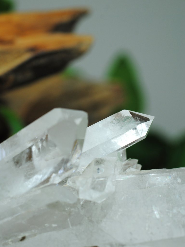 Ett helt unikt kluster med fantastiskt klara spetar i högsta kvalitet. Klustret har en bas av en större spest med flertal sammanväxta spestar som sträcker sig främst längs med spetsen. Vackert gnistrande kluster med inre, mindre bitar av klorit.