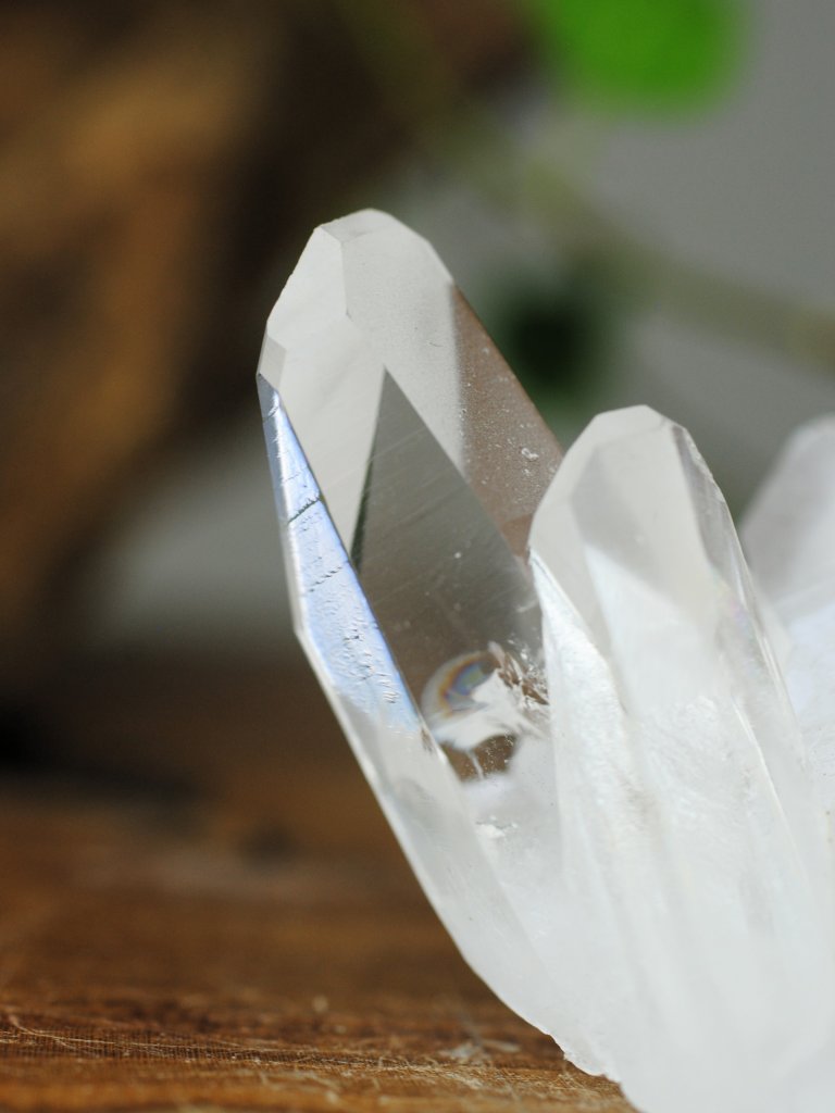 Ett helt unikt kluster med fantastiskt klara spetar i högsta kvalitet. Klustret har större spetsar som sträcker sig i samma riktning och en mindre regnbåge som tydligt träder fram i olika vinklar.