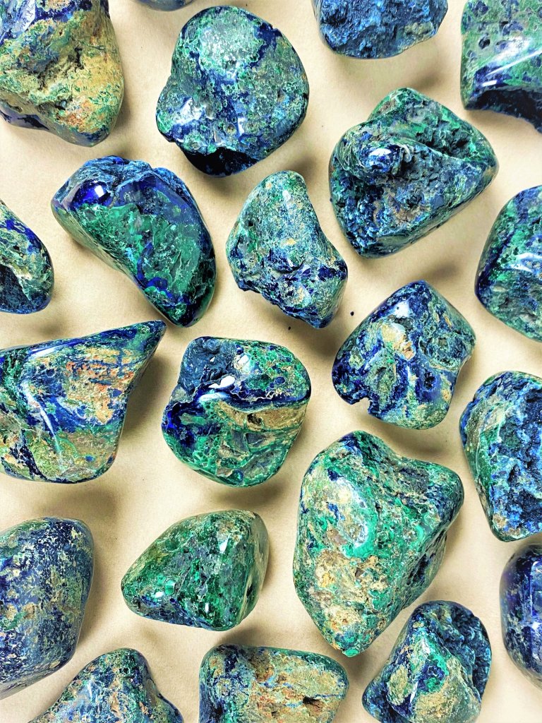Azurit Malakit är en kombination av stenarna Azurit och Malakit precis som namnet avslöjar. Den bär på samma egenskaper från de båda kristallerna vilket gör den mycket kraftfull och användbar inom flera områden.