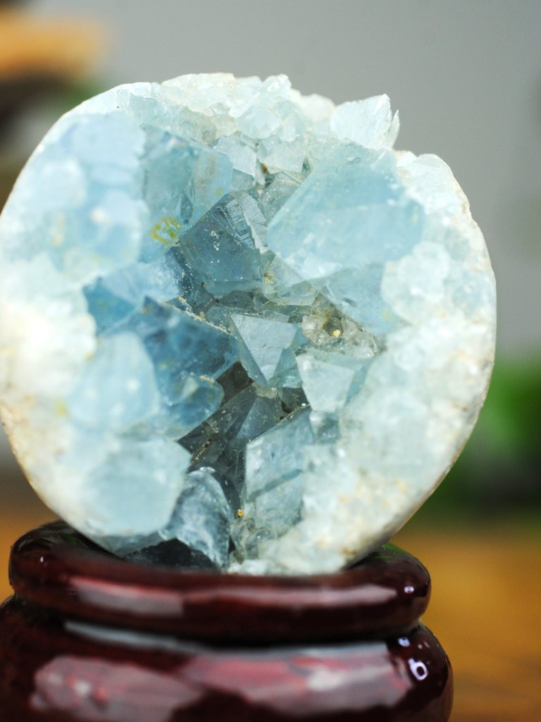 Fantastiskt vackert klot i Celestin. Klotet har en större krater som täcker halva klotet, fyllt med gnistrande blåa kristaller.