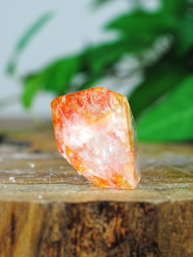 En förtrollande vacker sten med klar kvarts som avslöjar ett unikt, färggrant inre. Spetsen har en unik form, skuren med spetsiga kanter.
