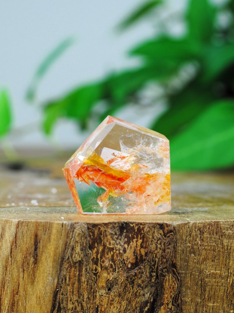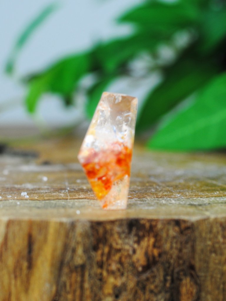 En förtrollande vacker sten med klar kvarts som avslöjar ett unikt, färggrant inre. Spetsen har en unik form, skuren med spetsiga kanter.