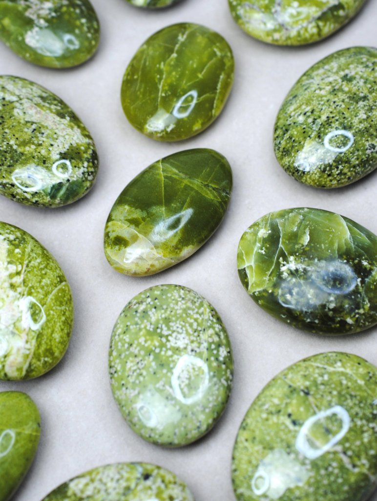 Mycket fina polerade handstenar i Grön Serpentin med unika, naturliga mönster och nyanser.
