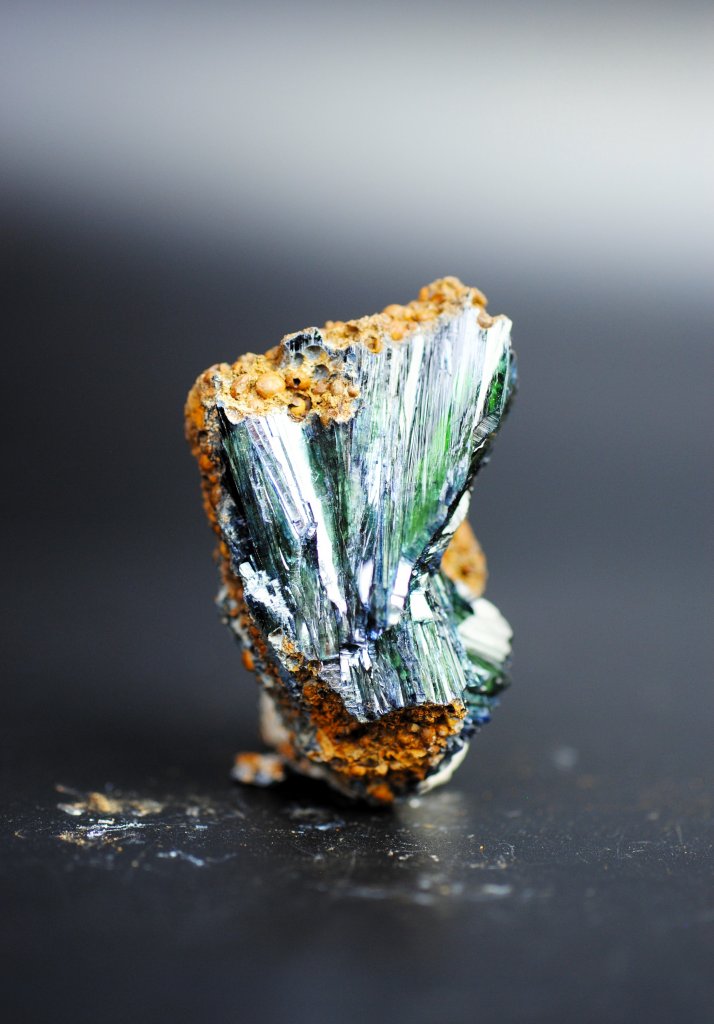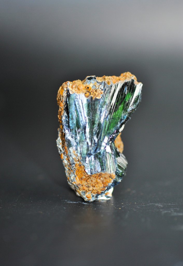 Fantasitskt fin Vivianit i större storlek. Denna kristall har mörka glänsande toner där de naturliga färgerna lyser igenom i ljuset.