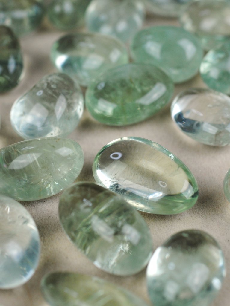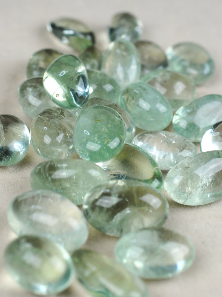 Vackra trumlade stenar i högsta kvalité av äkta/ naturlig Prasiolit. Stenarna är klara i tonen, har mindre men glänsande inklusioner och varierar något i form. Vissa har även inre regnbågar.