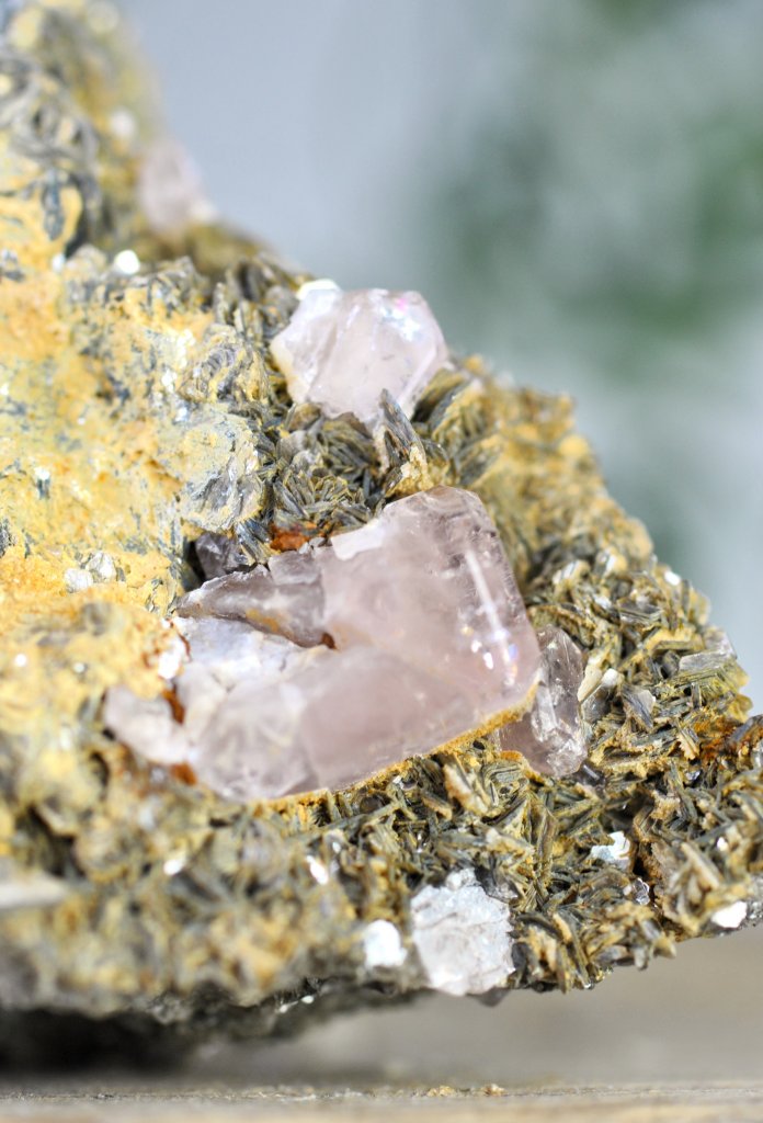 Rosa Apatitkristaller uppvuxna på matrix omgivna av mica.