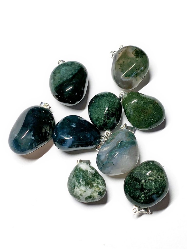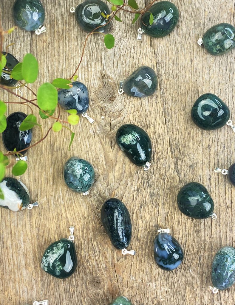 Fina hängen i polerad Moss Agat. Hängena varierar i form och naturliga mönster/ toner.