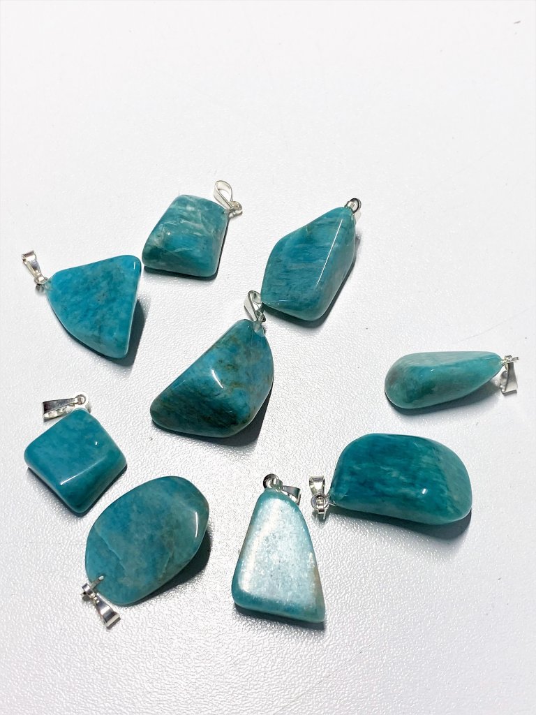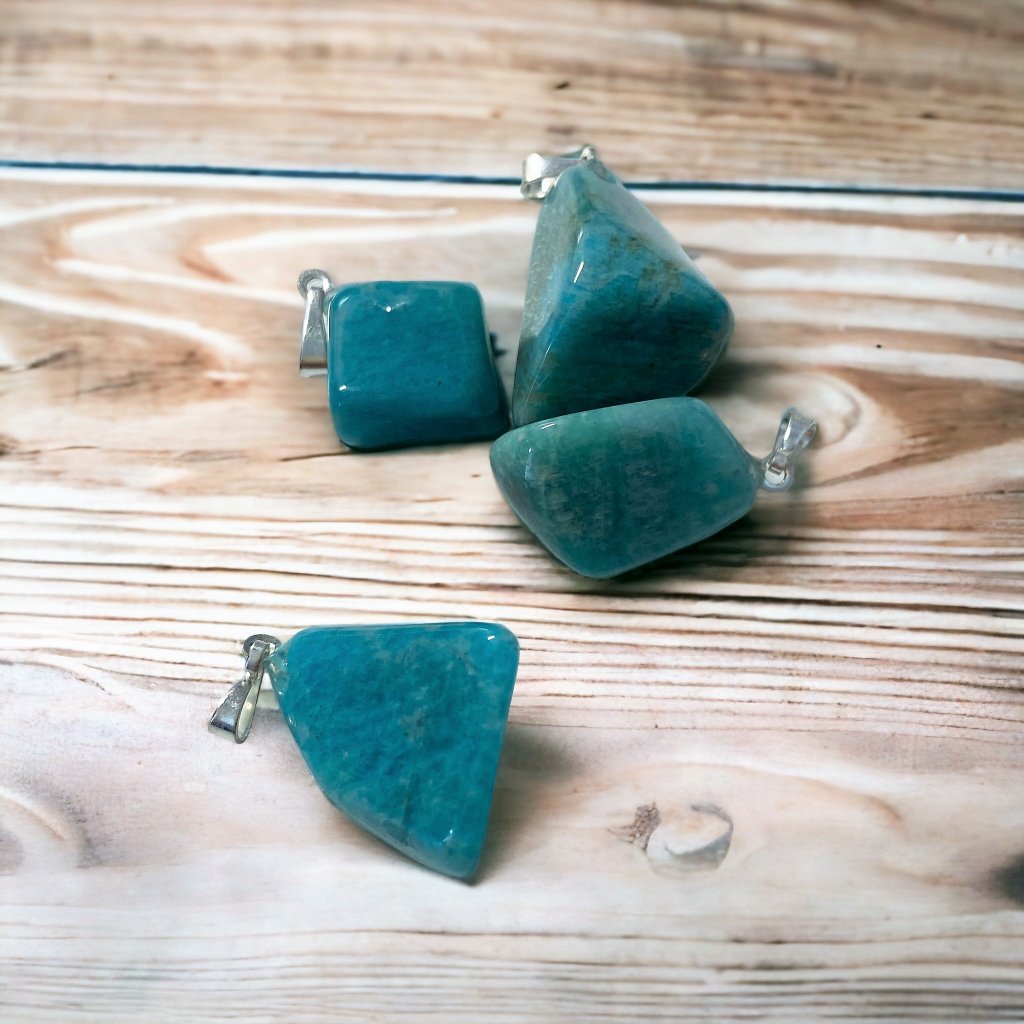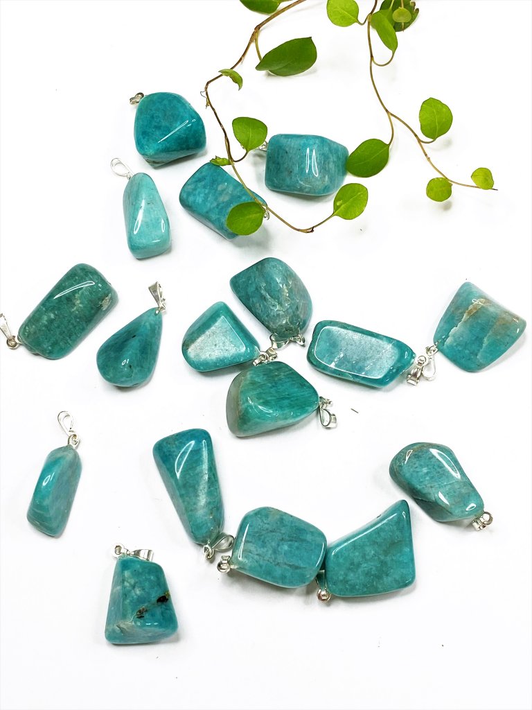 Vackra Amazonit nuggets i något varierande storlekar, med nickelfritt hänge